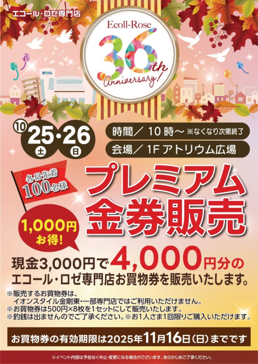各日先着100名様限定で現金3,000円で4,000円分のエコール・ロゼ専門店お買物券を販売いたします!
