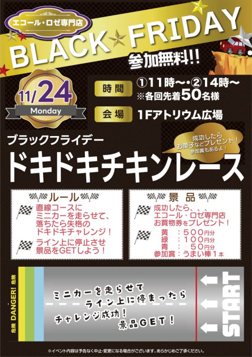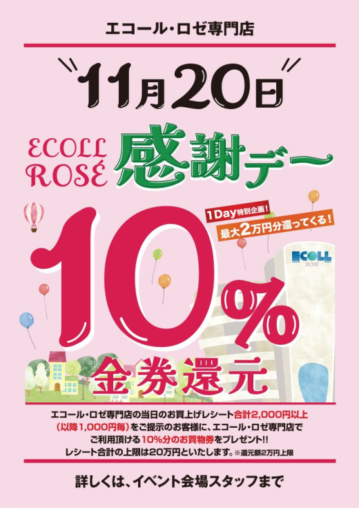 エコール・ロゼ専門店の当日のお買上げレシート合計2,000円以上(以降1,000円毎)をご提示のお客様に、専門店でご利用頂ける10%分のお買物券をプレゼント!
