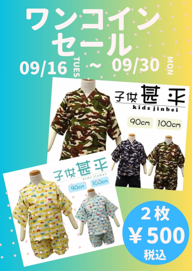 9月30日から延長いたしまして10月5日まで、お子様の甚平を2点¥500で販売させていただきます。
