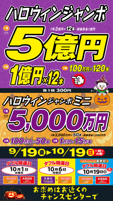また同時発売されます「ハロウィンジャンボミニ」は1等前後賞合わせて5千万円が最大 50本となっております。